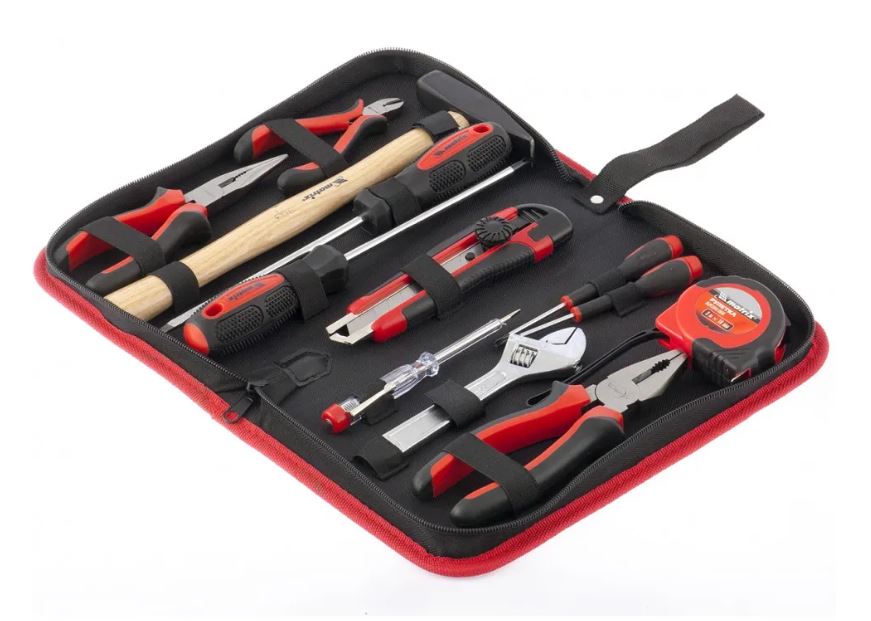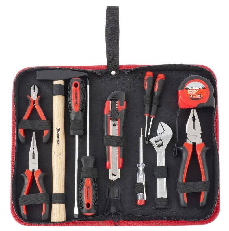 Набор Matrix 13562, состоящий из 12 предметов, подходит как для частных мастеров, так и для профессионалов при выполнении слесарно-монтажных работ. В него входят отвертки для резьбовых соединений, разводной ключ, нож для плотных материалов, рулетка, молоток, кусачки и тестер напряжения.