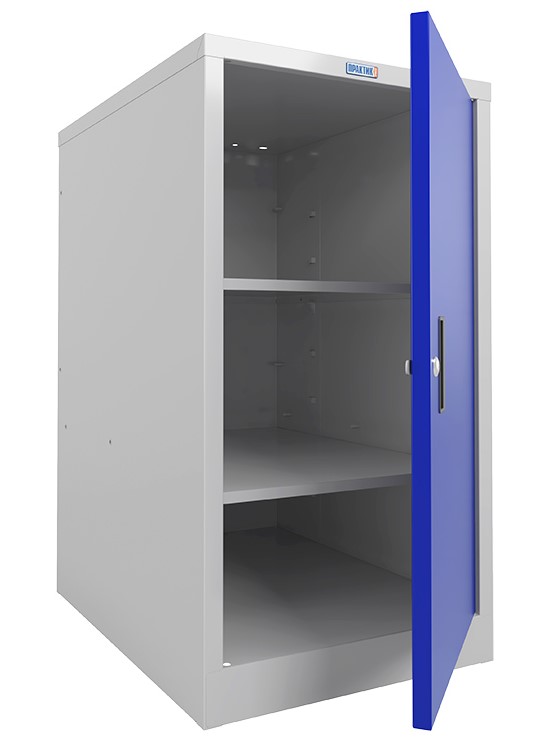 Тумба укомплектована 2-мя съемными регулируемыми полками и 1 дверцей, возможность смены стороны открывания двери. Ключевой замок на дверце тумбы. Нагрузка на полку 30 кг.