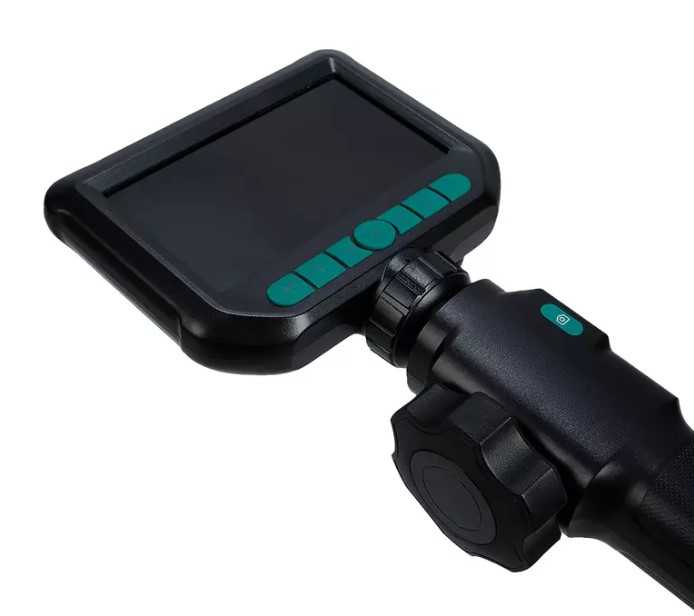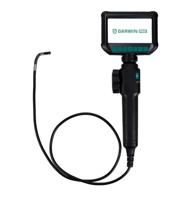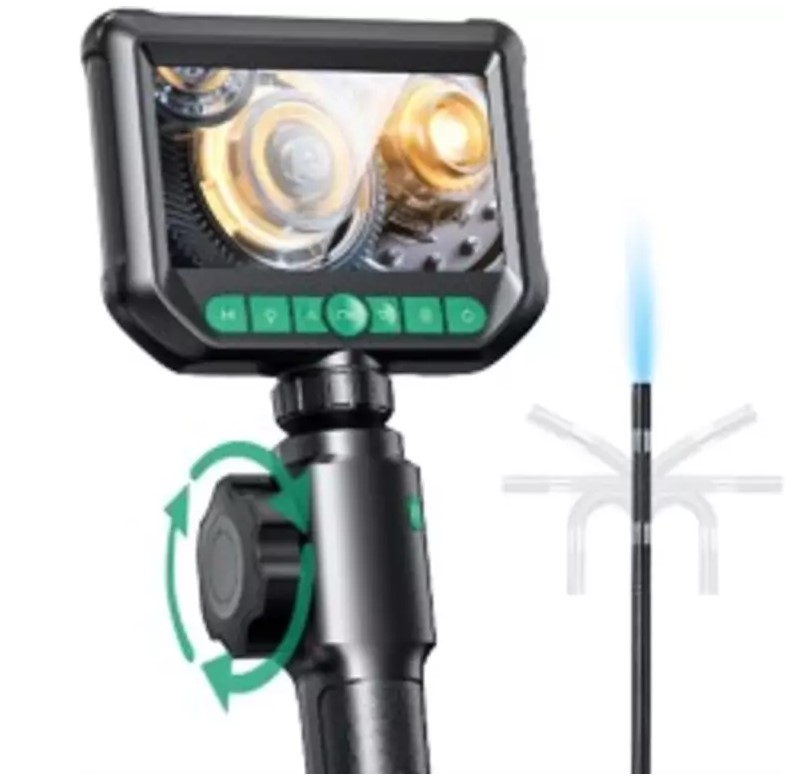 Видеоэндоскоп с экраном IPS диагональю 4,3 дюйма. Гибкий зонд длиной 1 метр и камерой диаметром 6 миллиметров, оснащённой двумя объективами. Камера управляемая, с углом обзора 360 градусов.