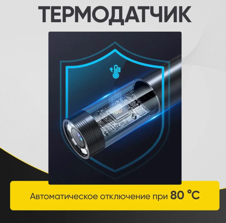 Зонд прибора оснащён встроенным термодатчиком, который отключает устройство при достижении температуры 80 °C, предотвращая перегрев головки камеры. Показания термодатчика отображаются на экране в режиме реального времени.