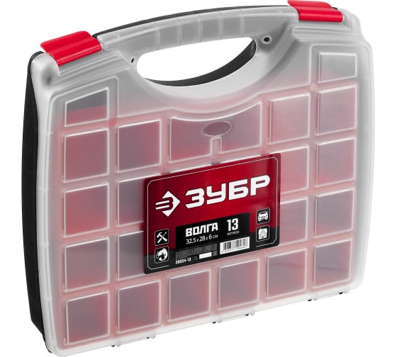 Органайзер ЗУБР ВОЛГА-13 38034-13 представляет собой удобное приспособление для хранения мелких предметов, таких как крепёж, метизы или соединители.
