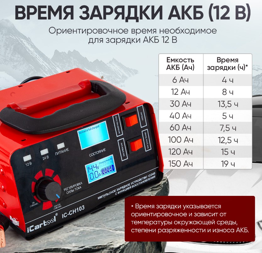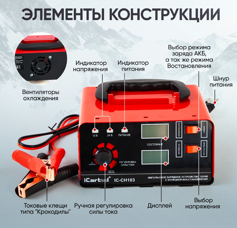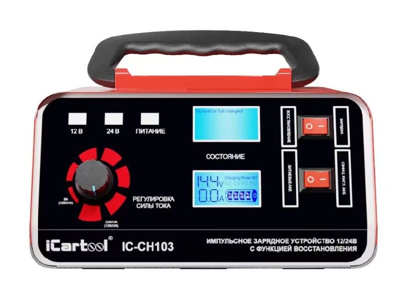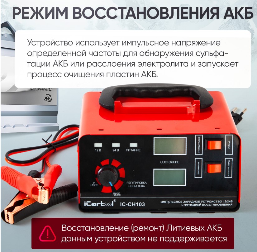 Заряжает и восстанавливает свинцово-кислотные аккумуляторы 12В/24В, включая AGM/GEL, кальциевые, VRLA и необслуживаемые, а также литиевые (кроме LiFePO4).
