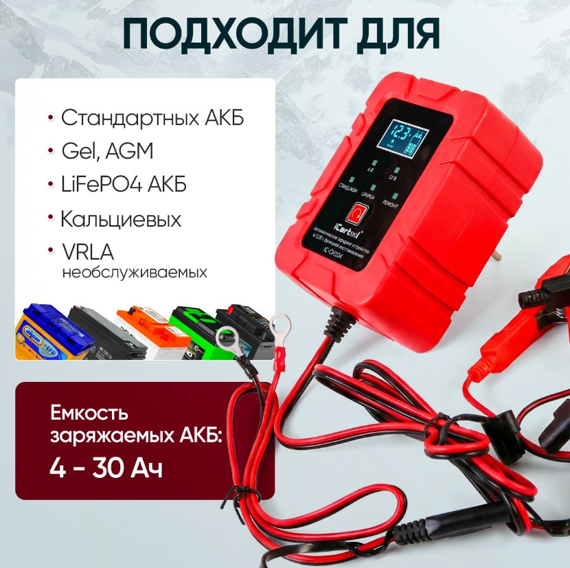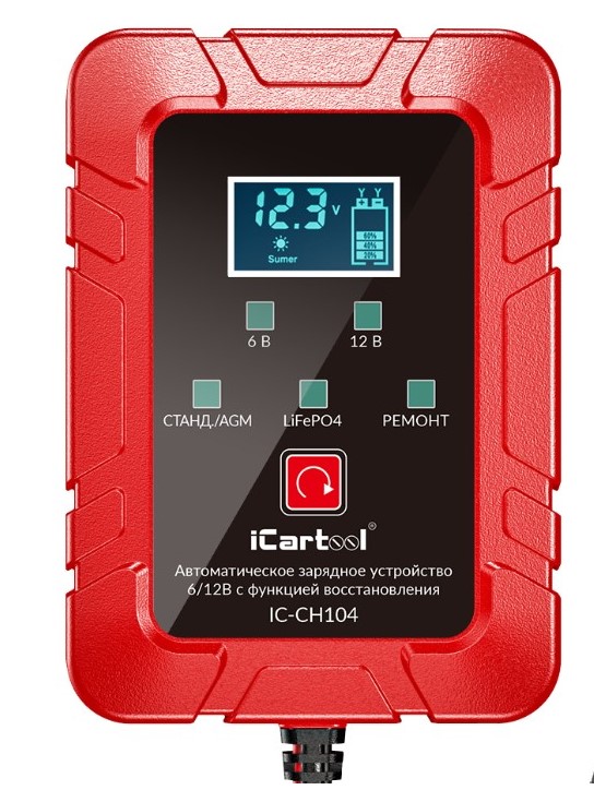 Автоматическое импульсное устройство iCartool IC-CH104 заряжает и восстанавливает свинцово-кислотные АКБ 6В/12В, включая AGM/GEL, кальциевые, VRLA и LiFePO4 (только зарядка). Зарядка проходит в 7 этапов с микропроцессорным контролем, адаптируя силу тока, напряжение и продолжительность зарядки под тип АКБ, что предотвращает перезарядку и перегрев. Восстановление устраняет сульфатацию и расслоение электролита, продлевая срок службы АКБ. Устройство имеет выбор типа АКБ, информативный ЖК-дисплей и многоуровневую защиту от перезаряда, короткого замыкания и переполюсовки.